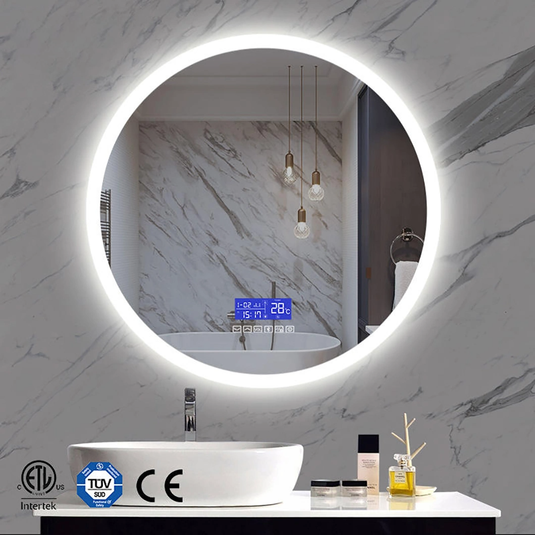 Thuis / Product / Badkamer spiegel / Ronde milieuspiegel Frame Wandophangtijd Display Glas Slimme badspiegels met LED-verlichting